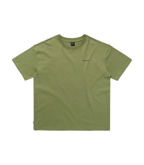 Gevonden informatie van het internet/productfotoās: Type: T-shirt Materiaal: 100% Biologisch katoen (gebruikelijk voor Mystic Profile Tee) Pasvorm: Regular Fit Details: Geribbelde ronde hals, kleine Mystic print op de borst, grote Mystic print op de rug, klein geweven label aan de zoom. Kleur: Olijfgroen/Groen (gezien op de foto) Doelgroep/Stijl: Casual lifestyle, surfkleding.