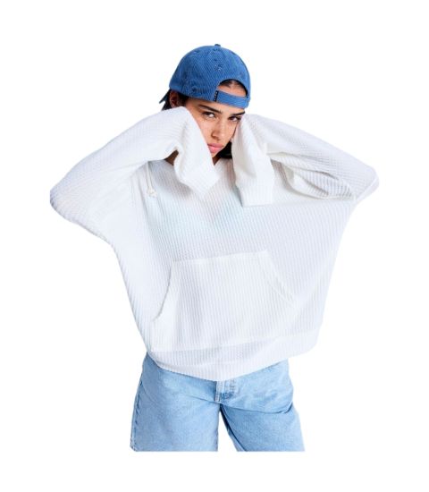De gevonden informatie voor de Roxy OCEAN DRIVE (ERJKT04323) betreft een wafelgebreide hoodie met een relaxed fit, samengesteld uit 60% katoen en 40% polyester, voorzien van een kangoeroezak en trekkoorden.
